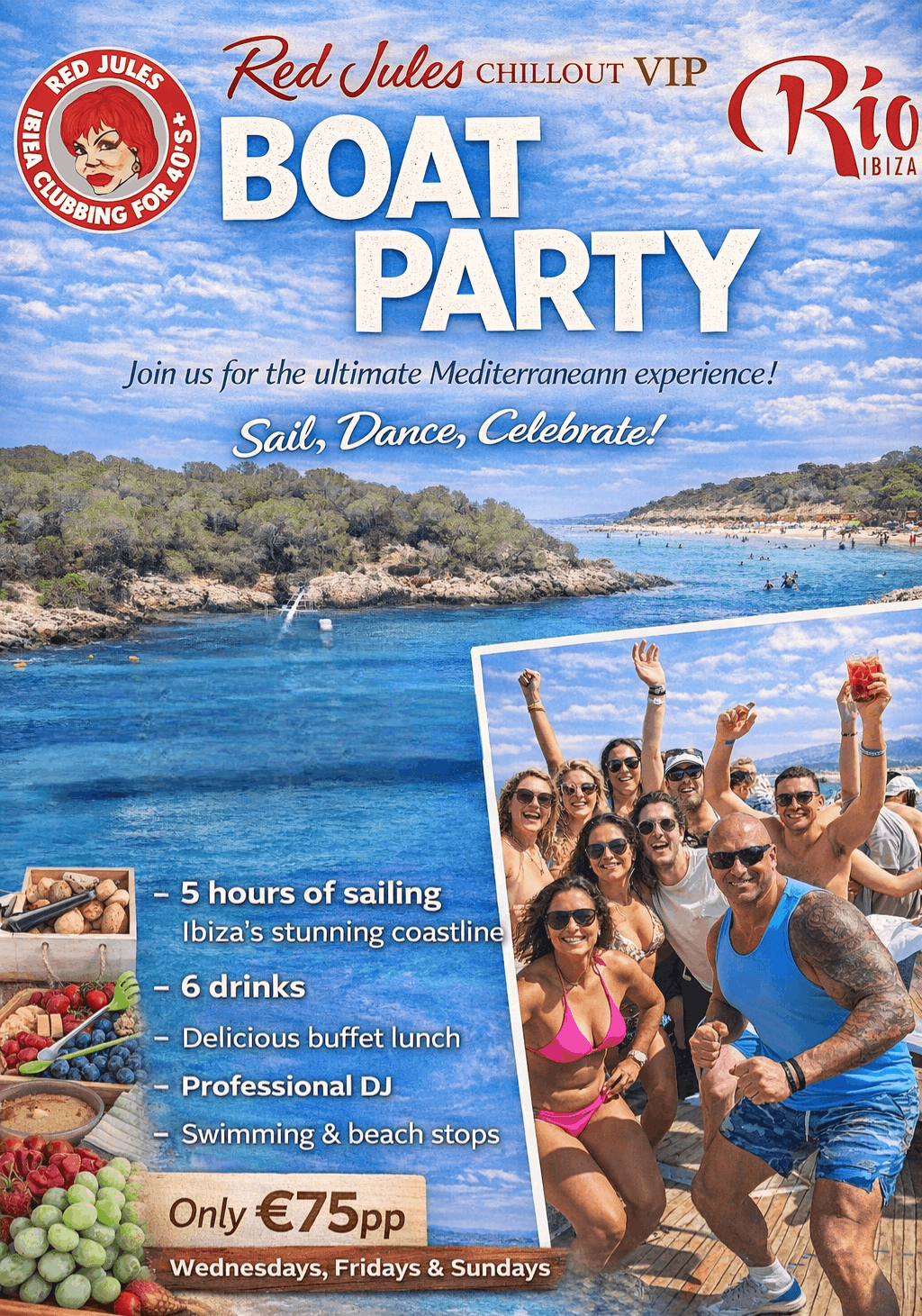 May - September every Wednesday, Friday & Sunday 12-5pm. Price per person (18yrs+ only) €75 Departing from San Antonio Marina Meeting point: Rio Ibiza, 11.15am