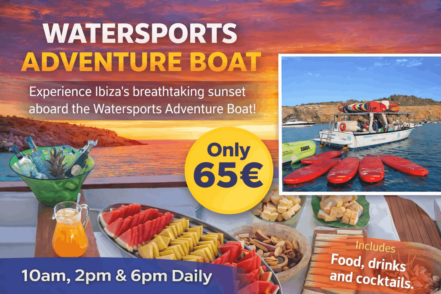 FUN WATERSPORTS Dive into the fun with snorkelling, paddle boarding, and more — all included in your ticket. DELICIOUS FOOD & DRINKS Soak up the magic of an unforgettable Ibiza boat tour, complete with delicious drinks & mouth-watering tapas. SPECTACULAR SUNSETS Experience Ibiza’s breathtaking sunset! This exclusive sunset boat tour gives you a front-row seat to one of the island’s most spectacular natural displays, 6-9pm daily. SMALL GROUPS Maximum of 40 people Only 65€ Includes Food, drinks and cocktails. Departs Daily from San Antonio Departing 10am, 2pm & 6pm for the sunset!